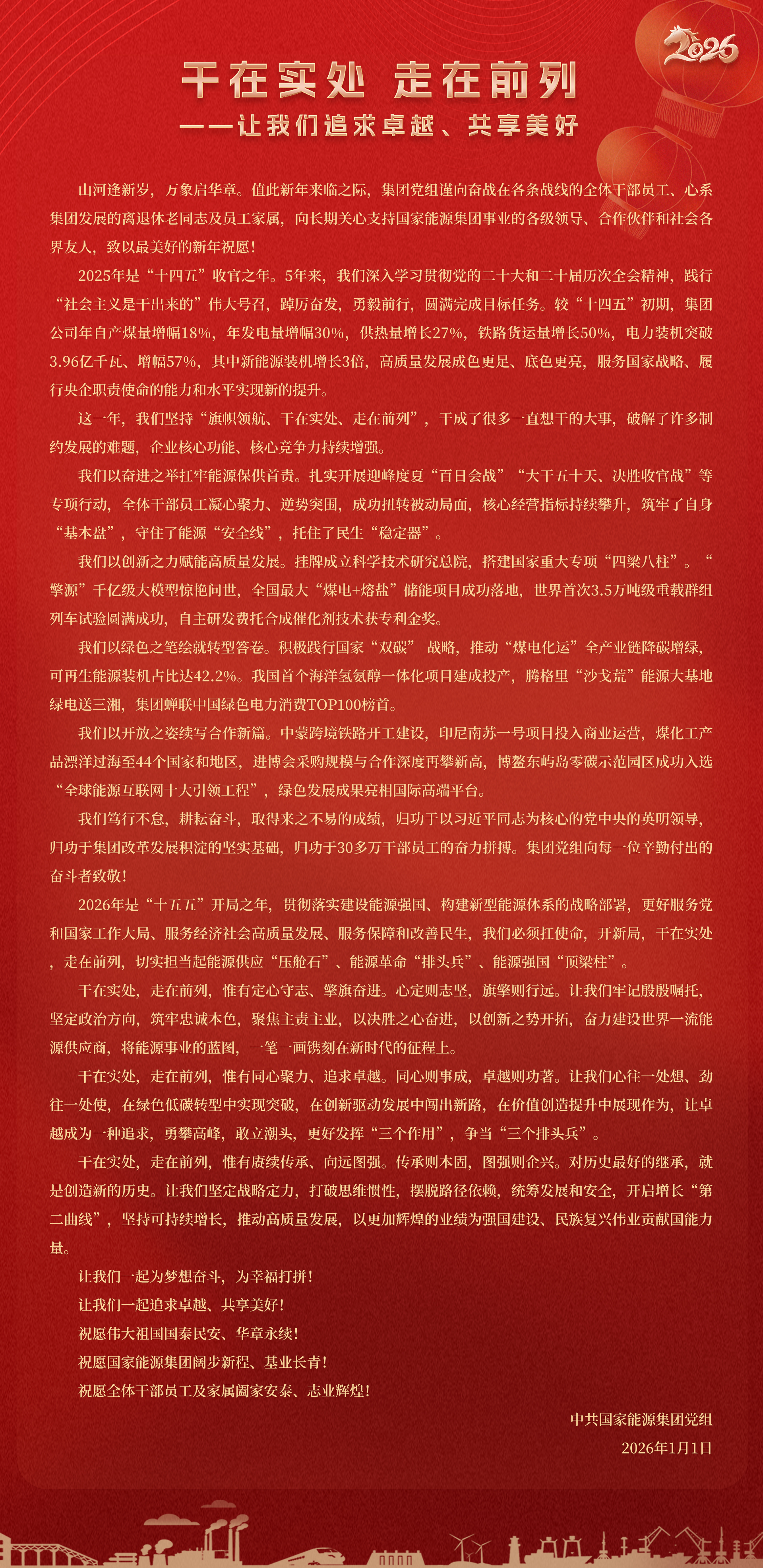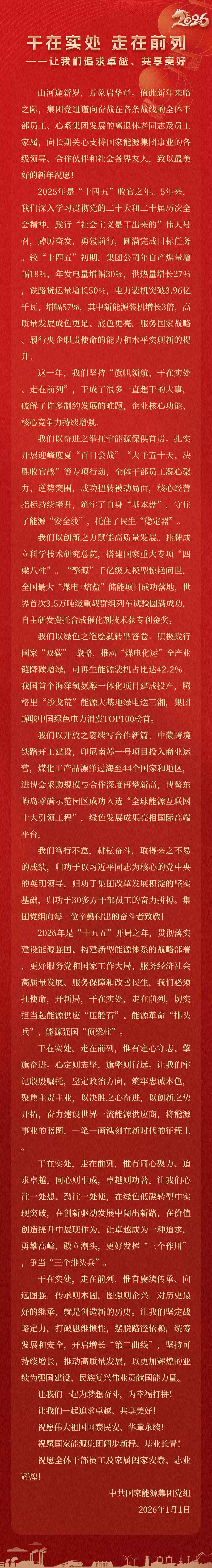 國(guó)家能源集團(tuán)胸懷“國(guó)之大者”,增產(chǎn)增供、穩(wěn)價(jià)穩(wěn)市,積極服從服務(wù)國(guó)家戰(zhàn)略、保障國(guó)家能源安全、助力國(guó)民經(jīng)濟(jì)穩(wěn)增長(zhǎng),推動(dòng)煤炭安全綠色智能、煤電清潔高效穩(wěn)定、現(xiàn)代煤化工高端多元低碳、運(yùn)輸物流協(xié)同一體、新能源多元?jiǎng)?chuàng)新規(guī)?;l(fā)展,全力擔(dān)當(dāng)能源強(qiáng)國(guó)頂梁柱,能源供應(yīng)壓艙石,能源革命排頭兵。